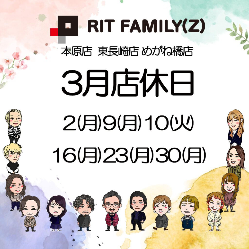 投稿日: 2026年2月27日 投稿者: RIT FAMILY(Z)3月の店休日 ★3月店休日のご案内です★ 2(月)9(月)10(火)16(月)23(月)30(月) ★受付時間 火水木金曜日 10:00~18:00 土 日曜日 9:30~17:30 共有:FacebookTwitterPinterestSkype