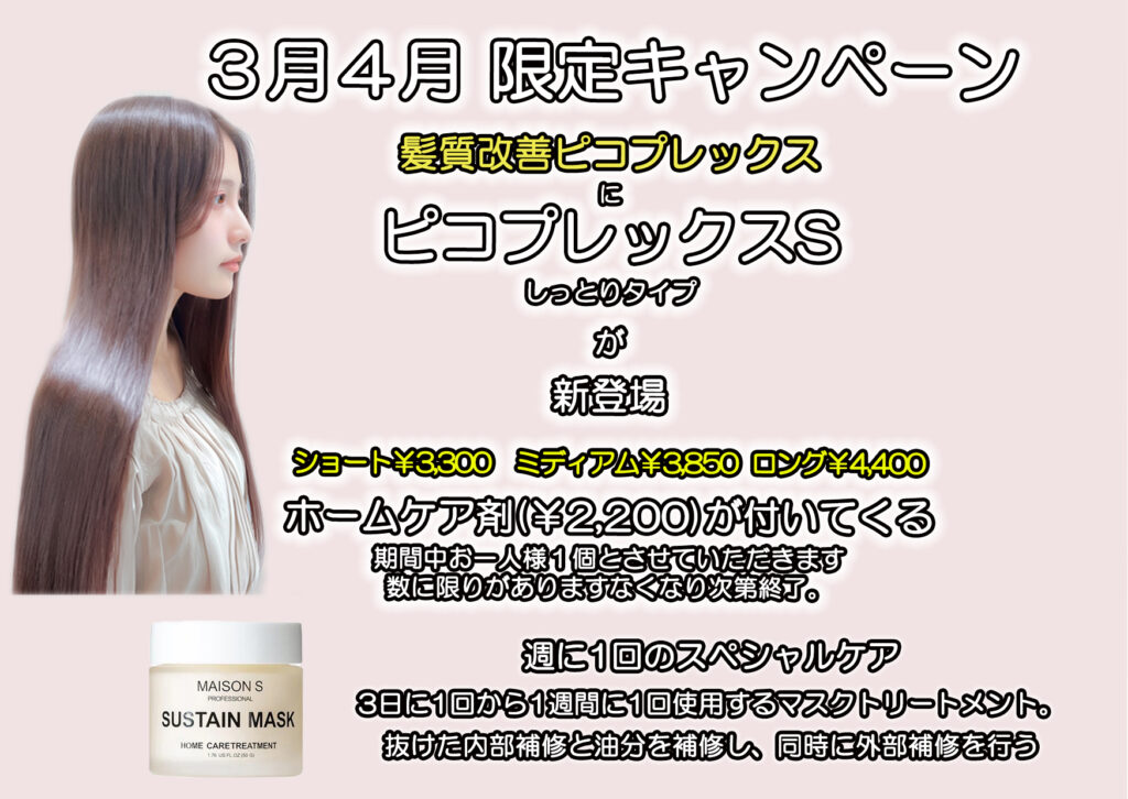 投稿日: 2026年2月28日 投稿者: RIT FAMILY(Z)3月キャンペーンのご案内 髪質改善に追加メニュー 様々な原因でダメージした髪に対してお応えできるように髪質改善を改良しています。 3月4月キャンペーンを開催します。是非この機会にご利用ください! 共有:FacebookTwitterPinterestSkype